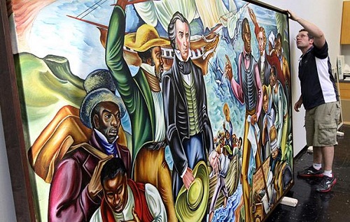 The first cycle of three murals, installed at the college’s Savery Library on the centennial of the 1839 mutiny on the slave ship La Amistad, depicts the uprising, trial and subsequent return to Africa of those freed men.