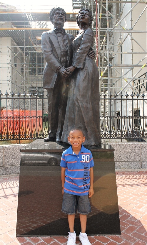 Daniel Noah Rose proudly poses in front of the newly erected Dred and Harriet Scott statue outside the old courthouse in downtown St. Louis, MO. The Dred Scott Heritage Foundation raised the money for the statue which was created by Harry Weber.