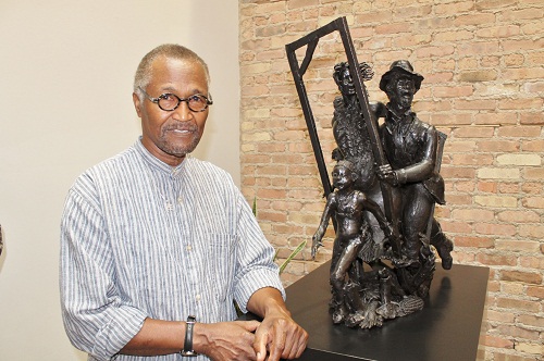 | Preston Jackson stands next to his sculpture Passages to Freedom which was unveiled June 16, 2012 at the County of Lake College in Waukegan, IL. BlackArtistNews photo. All rights reserved. |