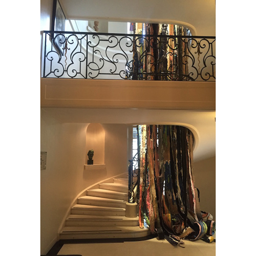 Furthering the idea of Los Angeles of a wasteland, the exhibition highlights a number of techniques, materials, and themes, examples of which include Edgar Arceneaux’s sculptural labyrinth library of crystallized books and scrolls engaging notions of the trajectory of Art History and African American identity; Lisa Anne Auerbach’s pairings of her political and provocative knitted panels and matching garments; Mark Bradford’s cascading sculptural painting in the staircase at the Mona Bismarck American Center of shreds of paper strips caked with paint and other debris edited from another work, referencing Bradford’s material and artistic waste; and Jon Pylypchuk’s anthropomorphic and otherworldy sculptural figures made of castaway objects such as cigarettes and old tennis rackets.