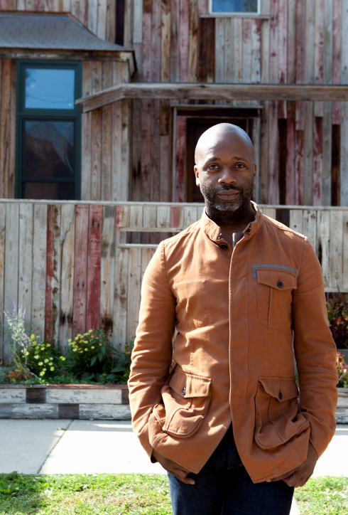 | Theaster Gates in front of “The Dorchester Projects”, photo by Sara Pooley via veralistcenter.org. |